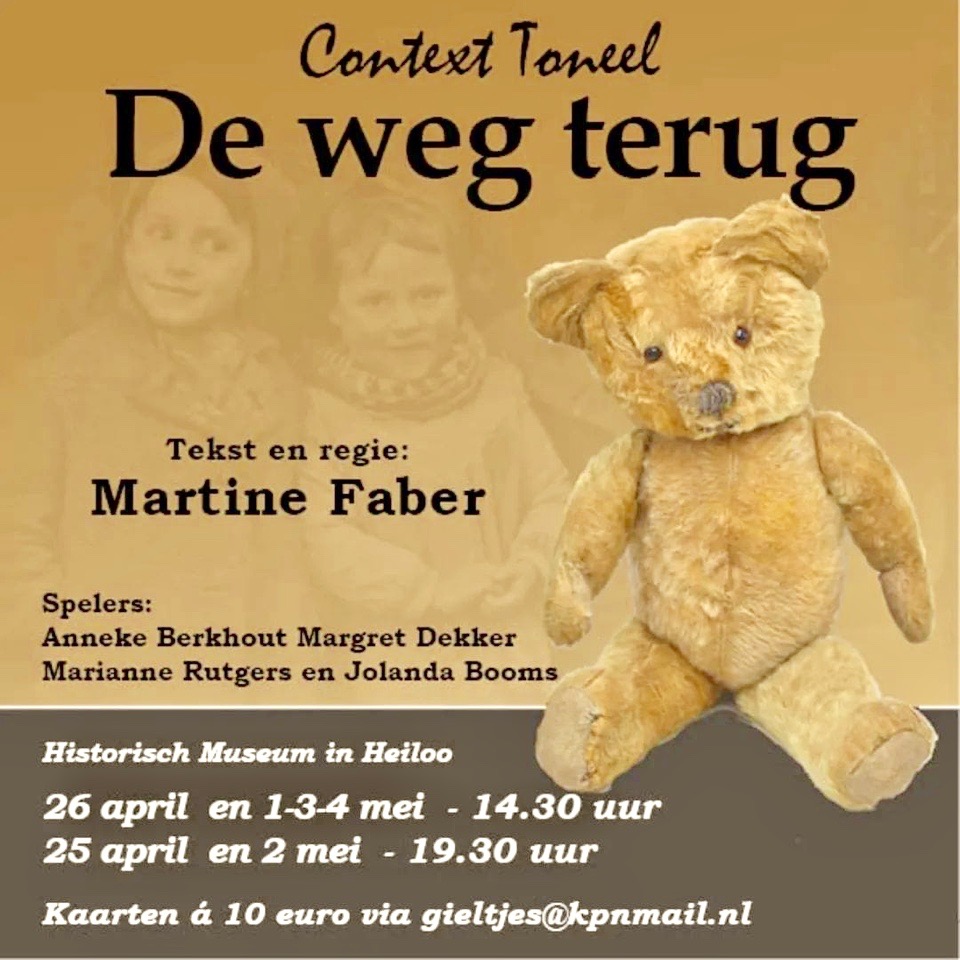 Naar traditie heeft Martine Faber een nieuw toneelstuk voor de mei-periode geschreven. ‘De weg terug’ gaat over de kindertransporten die voor en tijdens de Tweede Wereldoorlog plaatsvonden. De transporten hebben levens gered, maar lieten ook hun sporen na. Teddyberen gaven troost. Het belooft net als in de voorgaande jaren een prachtige voorstelling te worden. Op 26 april en 1, 3 en 4 mei zijn er middagvoorstellingen (aanvang: 14.30 uur). De avondvoorstellingen zijn op 25 april en 2 mei, 19.30 uur. Een kaartje kost 10 euro inclusief koffie/thee. Reserveer uw plek via gieltjes@kpnmail.nl